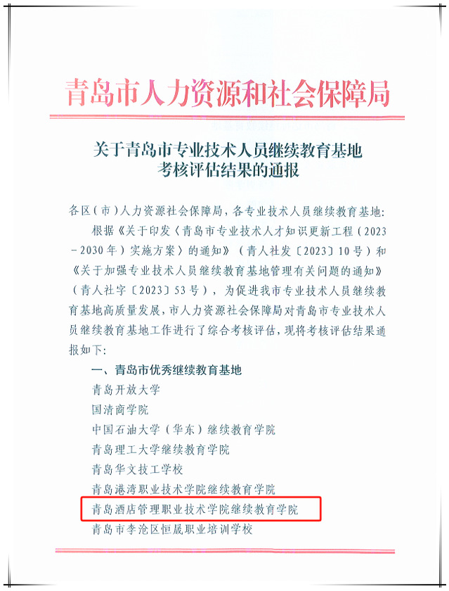 本网讯(继续教育学院 王艳)近日,青岛市人力资源和社会保障局下发了《关于青岛市专业技术人员继续教育基地考核评估结果的通报》,beat365继续教育学院获评青岛市优秀继续教育基地。