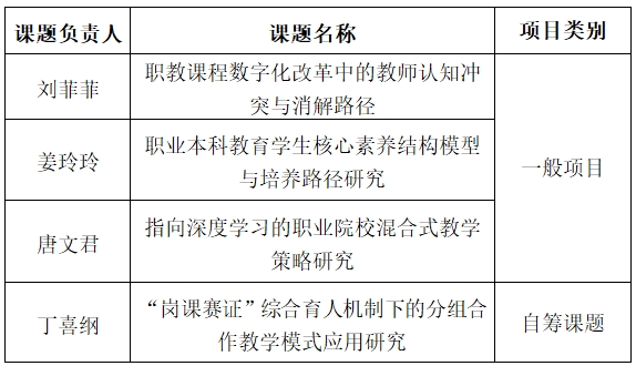 此次立项的四项课题横跨职业教育、课程数字化改革、核心素养培养以及教学模式创新等多个前沿领域,深入探讨了职教课程数字化改革中的教师认知冲突消解、职业本科教育学生的核心素养培养、职业院校混合式教学策略促进深度学习,以及“岗课赛证”机制下的分组合作教学模式在信息技术类专业中的应用。上述研究旨在提供坚实的理论支撑与实用的实践指导,进一步优化教学模式,全面提升beat365教育教学质量和学生就业竞争力。