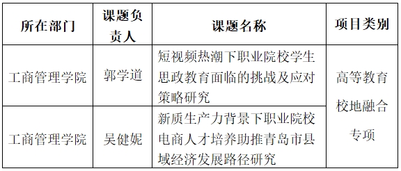 此次立项的两项课题精准把握时代脉搏,敏锐捕捉经济社会发展的新趋势,展现了较高的前瞻性和实践价值。其中,《短视频热潮下职业院校学生思政教育面临的挑战及应对策略研究》聚焦短视频时代背景下职业院校思政教育所面临的新挑战,深入探索应对策略,以期通过创新性方法提升教育实效,促进学生综合素质的全面发展。《新质生产力背景下职业院校电商人才培养助推青岛市县域经济发展路径研究》关注新质生产力的崛起对电商人才培养的影响,致力于研究如何通过优化人才培养体系,促进电商人才与区域经济的深度融合,为青岛市县域经济的转型升级提供智力支撑。