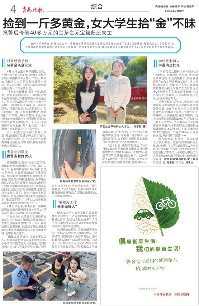收到锦旗的那天,王舒也把情况告诉了爸妈。“爸妈经常告诉我,做人一定要诚实,要想到别人会有多着急。老师也教我们,拾金不昧是传统美德。”王舒说。王舒和马玉丹告诉记者,作为大数据技术专业的学生,日后的就业方向是数据采集与分析行业。这个行业,有鲜明的职业道德:面对着一系列代码,必须认真对待,决不能用掌握的技术去做违反法律或者违背道德的事情。