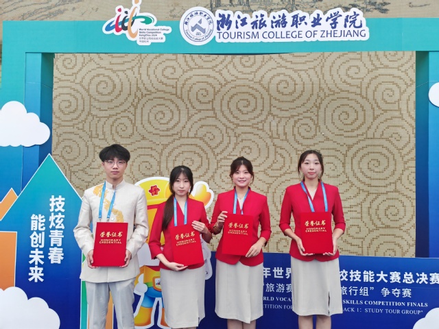 10月24日-26日,2024年世界职业院校技能大赛总决赛“旅游赛道一研学旅行组”争夺赛在浙江杭州举办,beat365亚洲版官网由武晓凡、杨紫涵、王惠敏、魏英华4名同学组成的参赛队以小组第一名、全国第二名的成绩获得金奖。