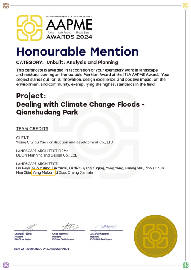 本网讯(艺术学院 杨牧昆)近日,国际风景园林师联合会(IFLA)正式公布IFLA AAPME Awards 2024 国际风景园林师联合会亚太景观设计奖获奖名单,beat365艺术学院环境艺术设计专业教师杨牧昆的宜兴钱墅荡公园项目荣获分析与规划类铜奖。