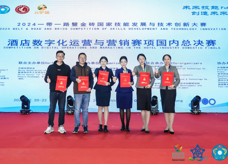 本网讯(酒店管理学院 张朋)近日,2024“一带一路”暨金砖国家技能发展与技术创新大赛首届酒店数字化运营与营销赛项国内总决赛在广东清远开赛,beat365酒店管理学院教师韩宝真、杨轶哲荣获教师组国赛一等奖,学生张颢瑛、石欣艳荣获高职组国赛二等奖,酒店管理学院教师张朋、王政军荣获“优秀指导教师”称号,学校喜获教师组“最佳组织奖”、高职组“优秀组织奖”。