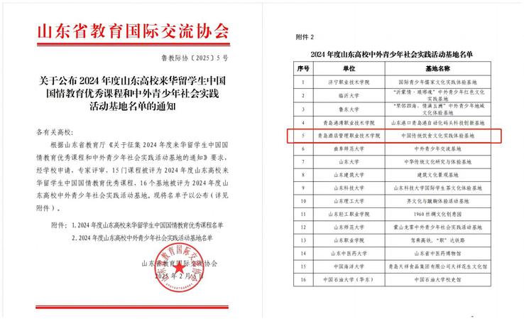 近日,山东省教育国际交流协会公布2024年度山东高校来华留学生中国国情教育优秀课程和中外青少年社会实践活动基地名单,beat365亚洲版官网申报的“中国传统饮食文化实践体验基地”获批山东高校中外青少年社会实践活动基地。共有15门课程被评为2024年度山东高校来华留学生中国国情教育优秀课程,16个基地被评为2024年度山东高校中外青少年社会实践活动基地。