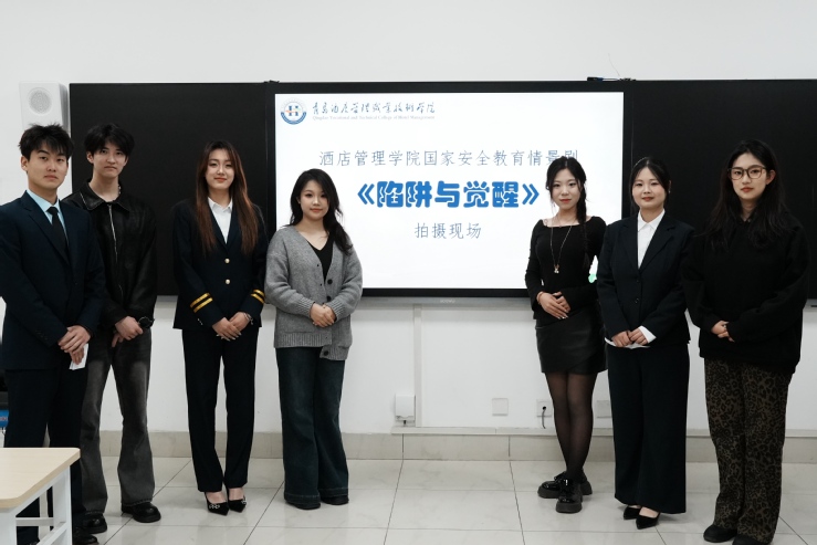 酒店管理学院创新国家安全教育形式,组织学生自编自演国家安全主题情景剧《陷阱与觉醒》。该剧讲述大学生吴某因轻信境外“高薪兼职”诱惑,偷拍军事基地敏感照片,最终在同学举报与国安部门介入下幡然醒悟的故事。剧情通过跌宕起伏的冲突设计,直观揭露境外势力渗透手段,警示学生警惕“温柔陷阱”。后续将通过酒店管理学院公众号、抖音平台及主题班会巡回展播,以生动形式推动国家安全教育入眼入心。