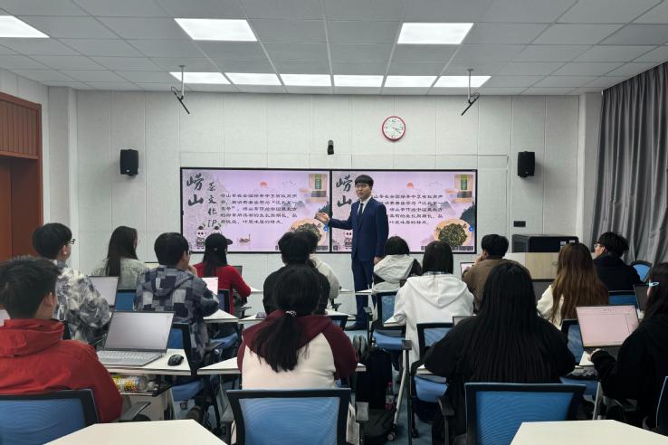 文旅学院以“数字技术+文化创意”为核心,组织开展“家乡文旅IP设计展示会”。学生结合家乡特色,运用Canva等数字化工具,设计文旅宣传方案并登台讲解。2024级研学旅行管理与服务专业学生张汉亭通过动态PPT,生动展示了崂山茶文化IP“山海茶韵”,融入手绘地图、短视频片段及互动问答环节,让观众沉浸式感受崂山茶旅融合的魅力。活动现场,评委从创意性、数字化呈现、文化内涵等维度进行点评,最终对10组优秀方案进行表彰。