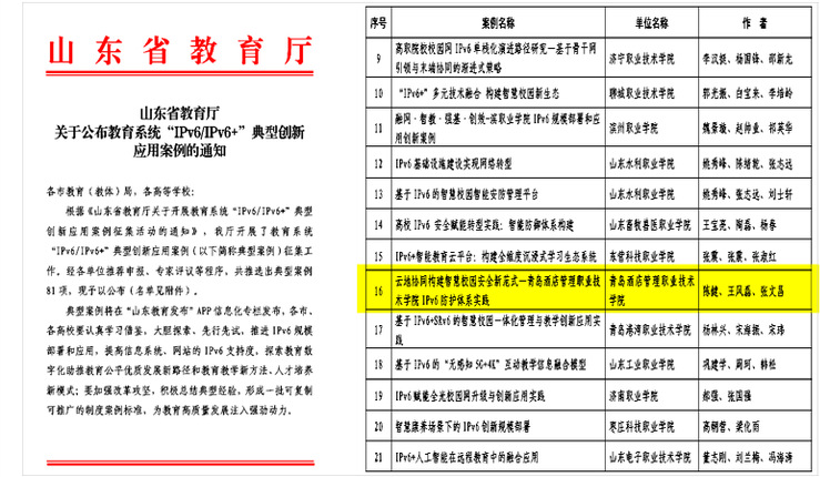 本网讯(教育信息中心 张文昌)近日,山东省教育厅公布了2024年教育系统“IPv6/IPv6+”典型创新应用案例评选结果,学校报送的《云地协同构建智慧校园安全新范式—beat365亚洲版官网IPv6防护体系实践》入选。