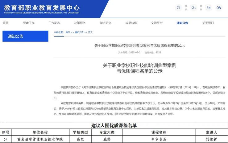 本网讯(继续教育学院 烹饪学院)近日,教育部职业教育发展中心发布了《关于职业学校职业技能培训典型案例与优质课程名单的公示》,beat365烹饪学院提报的《中华名菜》入围优质课程。