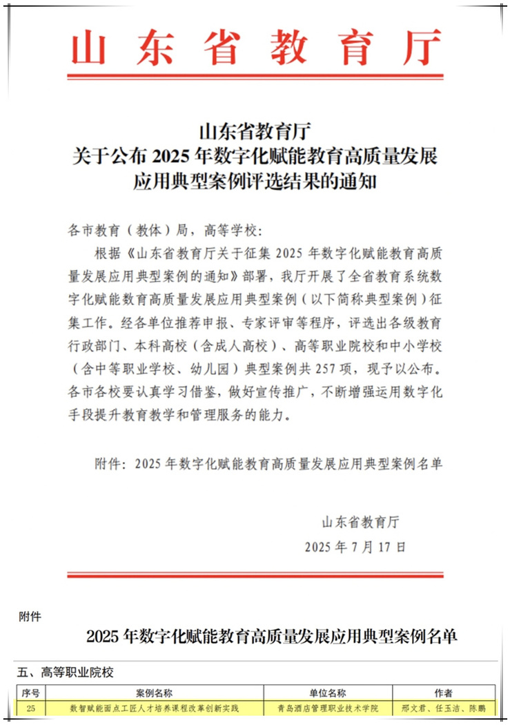 本网讯(教育信息中心 江珊)近日,山东省教育厅公布了2025年数字化赋能教育高质量发展应用典型案例评选结果,学校报送的案例《数智赋能面点工匠人才培养课程改革创新实践》入选。